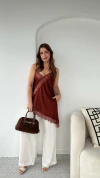 Blusa Emanuelly, é confeccionada em tecido leve com toque acetinado e acabamento em renda nas bordas. Seu decote em V valoriza o colo e o recorte assimétrico cria um visual moderno e fluido. As alças finas ajustáveis garantem conforto e caimento perfeito.