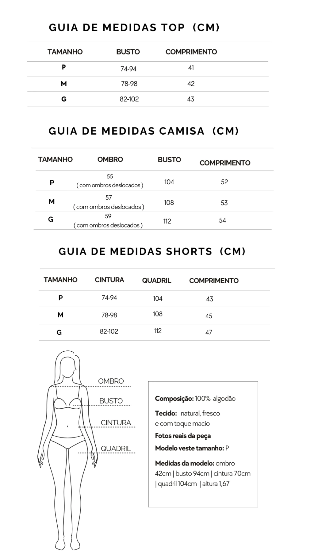 Medidas da Modelo: ombro 42cm | busto 94cm | cintura 70cm | quadril 105cm | altura 1,67